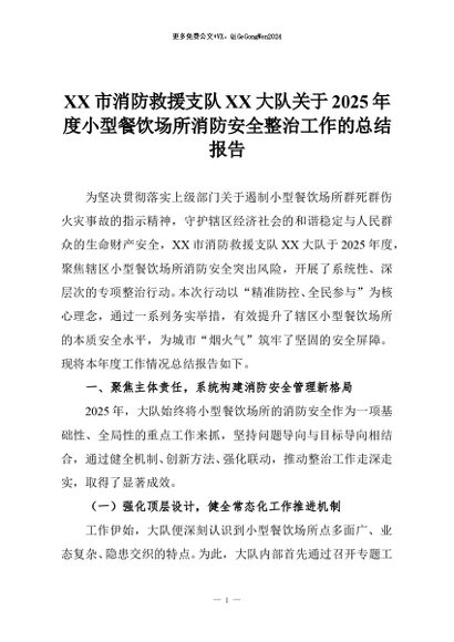 【七哥公文】2025年:XX市消防救援支队XX大队关于2025年度小型餐饮场所消防安全整治工作的总结报告+更多免费公文+VX:QiGeGongWen2024