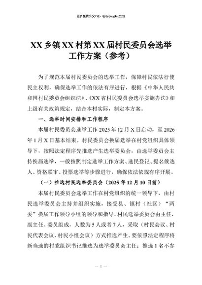 【七哥公文】2025年:XX乡镇XX村第XX届村民委员会选举工作方案(参考)+更多免费公文+VX:QiGeGongWen2024