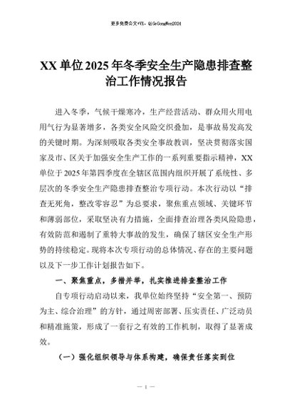 【七哥公文】2025年:XX单位2025年冬季安全生产隐患排查整治工作情况报告+更多免费公文+VX:QiGeGongWen2024