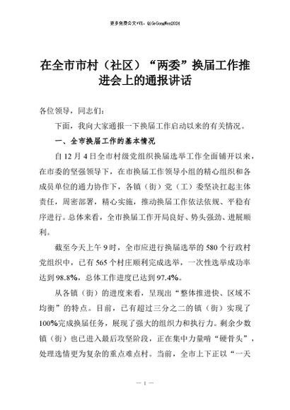 【七哥公文】2025年:在全市市村(社区)“两委”换届工作推进会上的通报讲话+更多免费公文+VX:QiGeGongWen2024