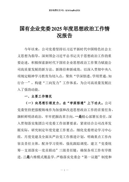 / 【七哥公文】2025年:国有企业党委2025年度思想政治工作情况报告+更多免费公文+VX:QiGeGongWen2024