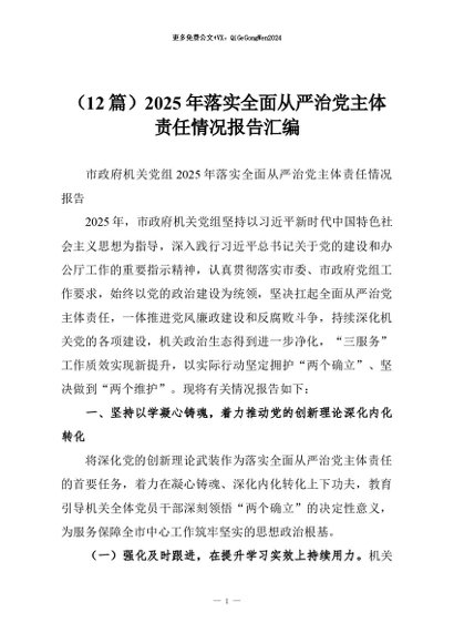 【七哥公文】2025年:(12篇)2025年落实全面从严治党主体责任情况报告汇编+更多免费公文+VX:QiGeGongWen2024