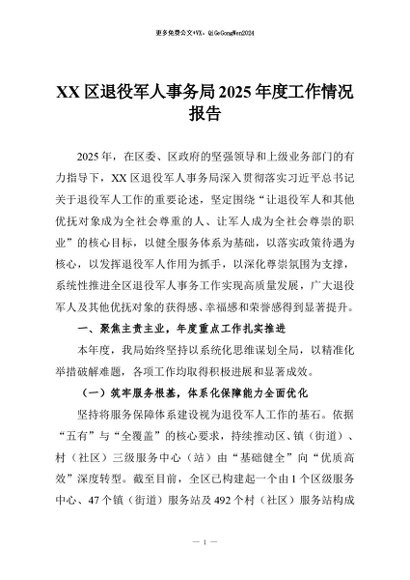 / 【七哥公文】2025年:XX区退役军人事务局2025年度工作情况报告+更多免费公文+VX:QiGeGongWen2024