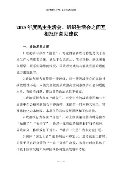 【七哥公文】2025年:2025年度民主生活会、组织生活会之间互相批评意见建议+更多免费公文+VX:QiGeGongWen2024