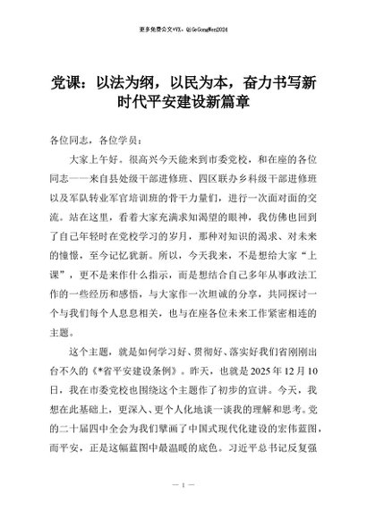【七哥公文】2025年:党课:以法为纲,以民为本,奋力书写新时代平安建设新篇章+更多免费公文+VX:QiGeGongWen2024