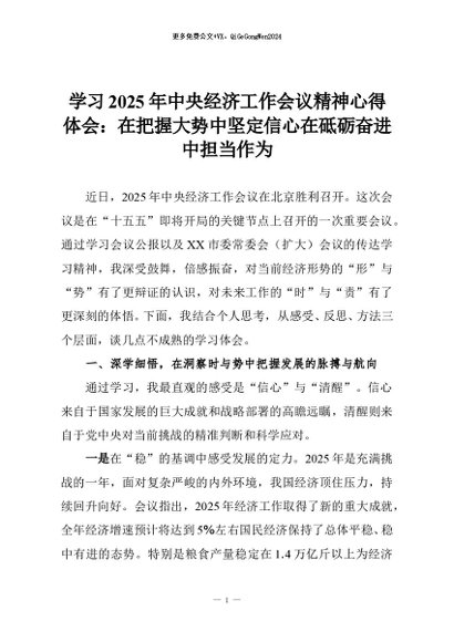 【七哥公文】2025年:学习2025年中央经济工作会议精神心得体会:在把握大势中坚定信心在砥砺奋进中担当作为+更多免费公文+VX:QiGeGongWen2024