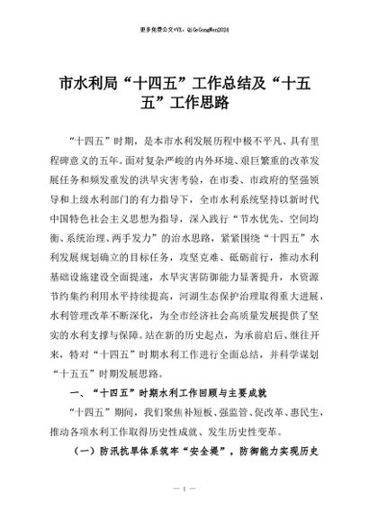 / 【七哥公文】2025年:市水利局“十四五”工作总结及“十五五”工作思路+更多免费公文+VX:QiGeGongWen2024