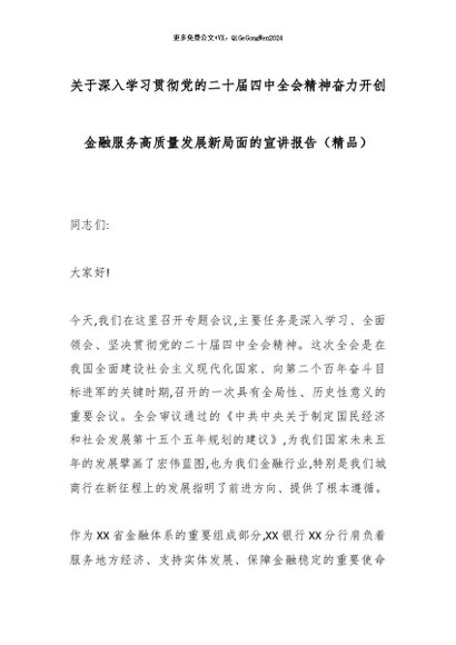 【七哥公文】2025年:关于深入学习贯彻党的二十届四中全会精神奋力开创金融服务高质量发展新局面的宣讲报告(精品)_副本+更多免费公文+VX:QiGeGongWen2024