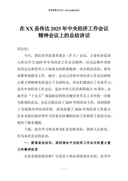 【七哥公文】2025年:在XX县传达2025年中央经济工作会议精神会议上的总结讲话+更多免费公文+VX:QiGeGongWen2024