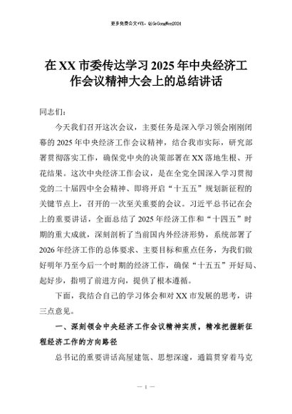 【七哥公文】2025年:在XX市委传达学习2025年中央经济工作会议精神大会上的总结讲话+更多免费公文+VX:QiGeGongWen2024