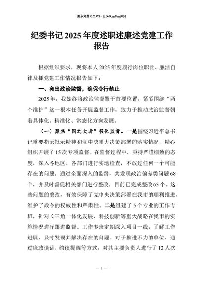 / 【七哥公文】2025年:纪委书记2025年度述职述廉述党建工作报告+更多免费公文+VX:QiGeGongWen2024