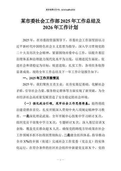 【七哥公文】2025年:某市委社会工作部2025年工作总结及2026年工作计划+更多免费公文+VX:QiGeGongWen2024