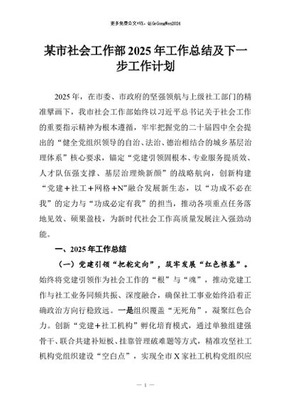 / 【七哥公文】2025年:某市社会工作部2025年工作总结及下一步工作计划+更多免费公文+VX:QiGeGongWen2024