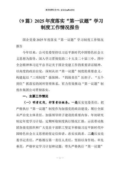 【七哥公文】2025年:(9篇)2025年度落实“第一议题”学习制度工作情况报告+更多免费公文+VX:QiGeGongWen2024