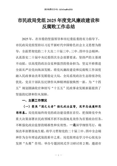 【七哥公文】2025年:市民政局党组2025年度党风廉政建设和反腐败工作总结+更多免费公文+VX:QiGeGongWen2024