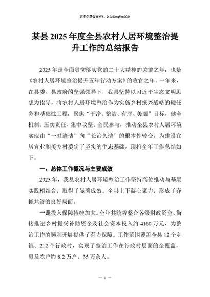 【七哥公文】2025年:某县2025年度全县农村人居环境整治提升工作的总结报告+更多免费公文+VX:QiGeGongWen2024