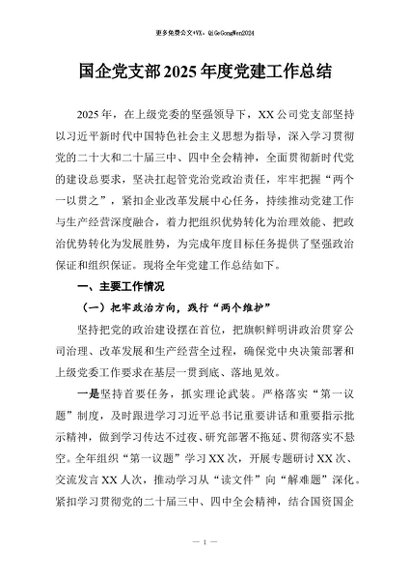 / 【七哥公文】2025年:国企党支部2025年度党建工作总结+更多免费公文+VX:QiGeGongWen2024