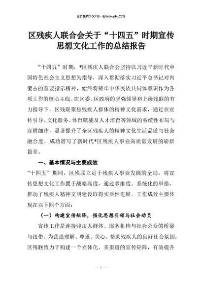 【七哥公文】2025年:区残疾人联合会关于“十四五”时期宣传思想文化工作的总结报告+更多免费公文+VX:QiGeGongWen2024