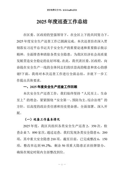 / 【七哥公文】2025年:2025年度巡查工作总结+更多免费公文+VX:QiGeGongWen2024