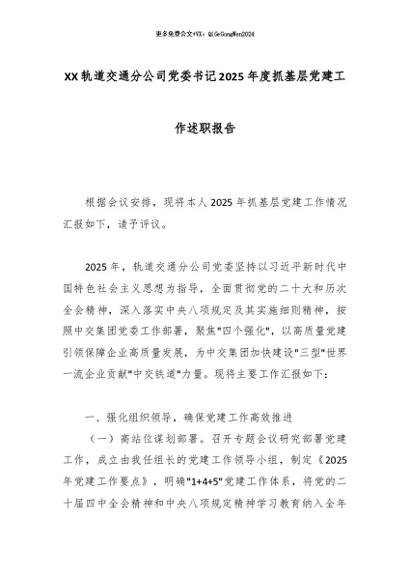 【七哥公文】2025年:XX轨道交通分公司党委书记2025年度抓基层党建工作述职报告_副本+更多免费公文+VX:QiGeGongWen2024