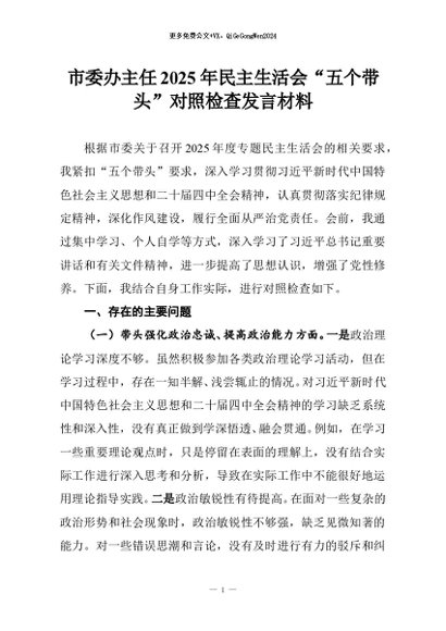 【七哥公文】2025年:市委办主任2025年民主生活会“五个带头”对照检查发言材料+更多免费公文+VX:QiGeGongWen2024