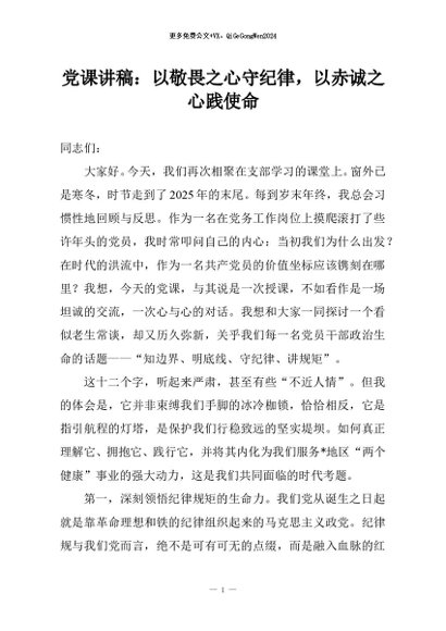 / 【七哥公文】2025年:党课讲稿:以敬畏之心守纪律,以赤诚之心践使命+更多免费公文+VX:QiGeGongWen2024