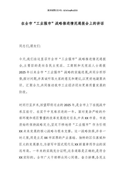 【七哥公文】2025年:在全市“工业强市”战略推进情况通报会上的讲话_副本+更多免费公文+VX:QiGeGongWen2024