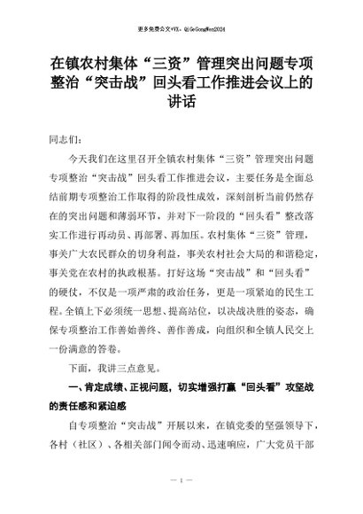 【七哥公文】2025年:在镇农村集体“三资”管理突出问题专项整治“突击战”回头看工作推进会议上的讲话+更多免费公文+VX:QiGeGongWen2024