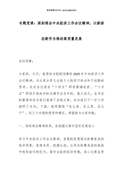 【七哥公文】2025年:专题党课:深刻领会中央经济工作会议精神,以新姿态新作为推动高质量发展_副本+更多免费公文+VX:QiGeGongWen2024