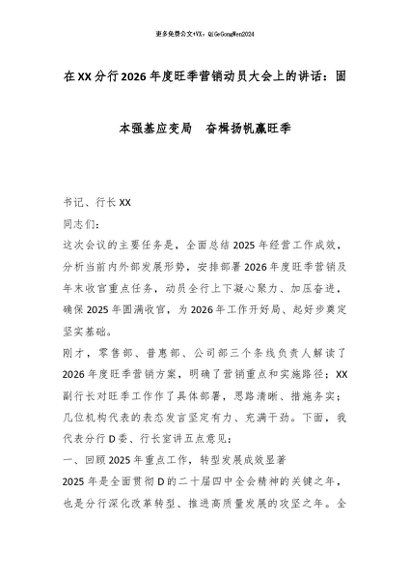 【七哥公文】2025年:在XX分行2026年度旺季营销动员大会上的讲话:固本强基应变局 奋楫扬帆赢旺季_副本+更多免费公文+VX:QiGeGongWen2024