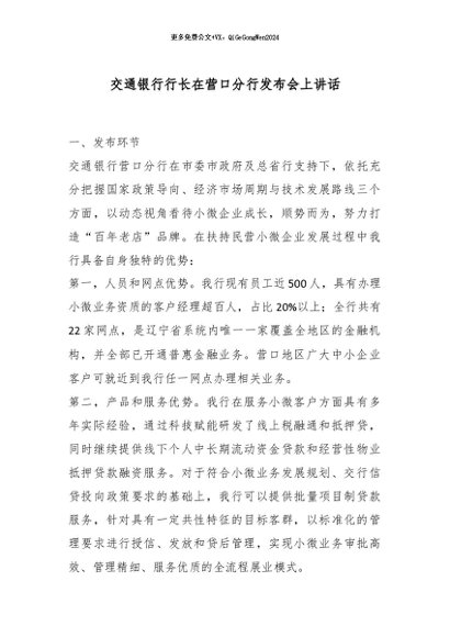 / 【七哥公文】2025年:交通银行行长在营口分行发布会上讲话_副本+更多免费公文+VX:QiGeGongWen2024