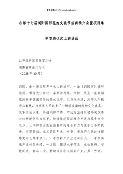 【七哥公文】2025年:在第十七届浏阳国际花炮文化节招商推介会暨项目集中签约仪式上的讲话_副本+更多免费公文+VX:QiGeGongWen2024