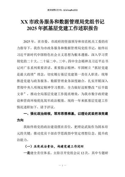 【七哥公文】2025年:XX市政务服务和数据管理局党组书记2025年抓基层党建工作述职报告+更多免费公文+VX:QiGeGongWen2024