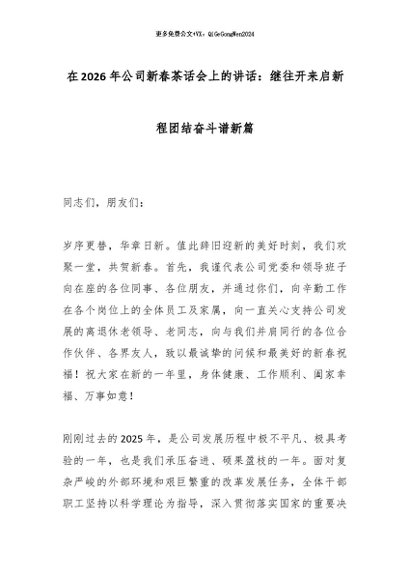 【七哥公文】2025年:在2026年公司新春茶话会上的讲话:继往开来启新程团结奋斗谱新篇_副本+更多免费公文+VX:QiGeGongWen2024