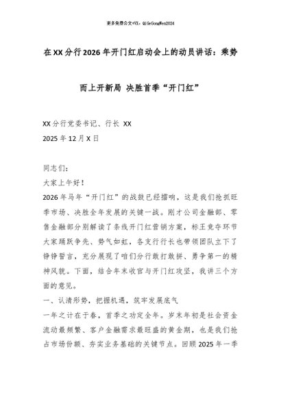 【七哥公文】2025年:在XX分行2026年开门红启动会上的动员讲话:乘势而上开新局 决胜首季“开门红”_副本+更多免费公文+VX:QiGeGongWen2024