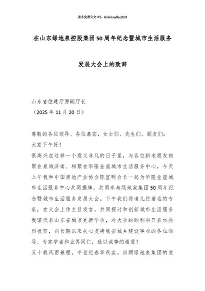 【七哥公文】2025年:在山东绿地泉控股集团50周年纪念暨城市生活服务发展大会上的致辞_副本+更多免费公文+VX:QiGeGongWen2024