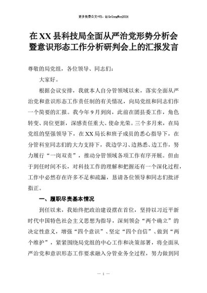 【七哥公文】2025年:在XX县科技局全面从严治党形势分析会暨意识形态工作分析研判会上的汇报发言+更多免费公文+VX:QiGeGongWen2024
