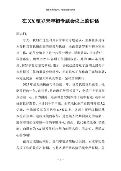 / 【七哥公文】2025年:在XX镇岁末年初专题会议上的讲话+更多免费公文+VX:QiGeGongWen2024