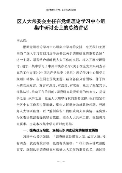【七哥公文】2026年:区人大常委会主任在党组理论学习中心组集中研讨会上的总结讲话+更多免费公文+VX:QiGeGongWen2024