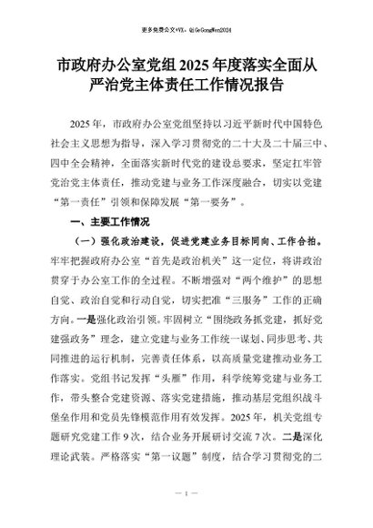 【七哥公文】2026年:市政府办公室党组2025年度落实全面从严治党主体责任工作情况报告+更多免费公文+VX:QiGeGongWen2024