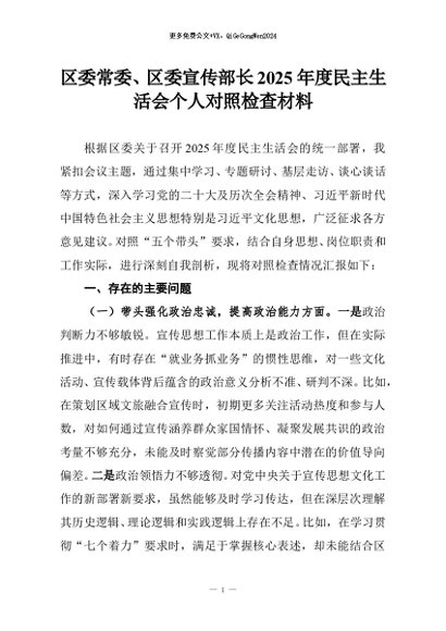 【七哥公文】2026年:区委常委、区委宣传部长2025年度民主生活会个人对照检查材料_副本+更多免费公文+VX:QiGeGongWen2024