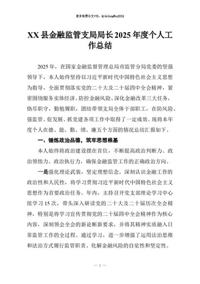 【七哥公文】2026年:XX县金融监管支局局长2025年度个人工作总结_副本+更多免费公文+VX:QiGeGongWen2024