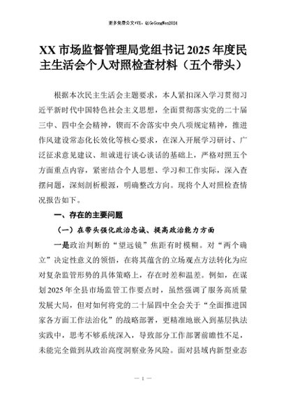【七哥公文】2026年:XX市场监督管理局党组书记2025年度民主生活会个人对照检查材料(五个带头)_副本+更多免费公文+VX:QiGeGongWen2024