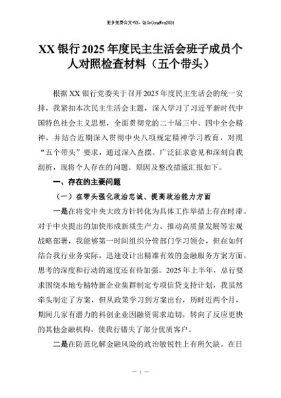 【七哥公文】2026年:XX银行2025年度民主生活会班子成员个人对照检查材料(五个带头)_副本+更多免费公文+VX:QiGeGongWen2024