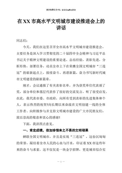 / 【七哥公文】2026年:在XX市高水平文明城市建设推进会上的讲话+更多免费公文+VX:QiGeGongWen2024