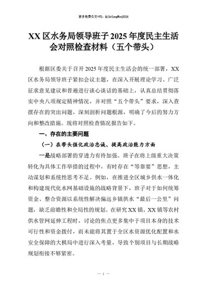 【七哥公文】2026年:XX区水务局领导班子2025年度民主生活会对照检查材料(五个带头)_副本+更多免费公文+VX:QiGeGongWen2024