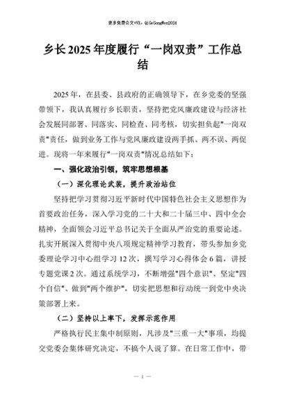 / 【七哥公文】2026年:乡长2025年度履行“一岗双责”工作总结_副本+更多免费公文+VX:QiGeGongWen2024