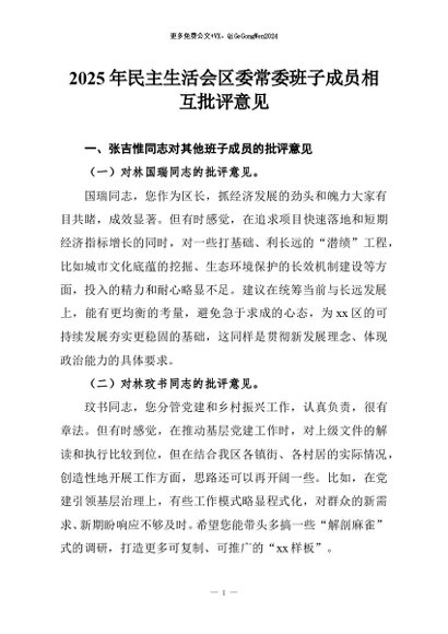 【七哥公文】2026年:2025年民主生活会区委常委班子成员相互批评意见_副本+更多免费公文+VX:QiGeGongWen2024