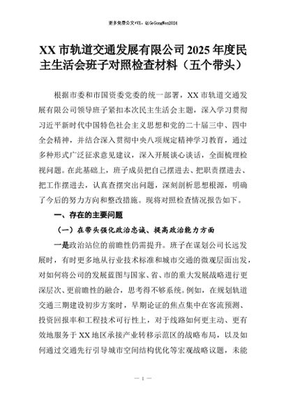 【七哥公文】2026年:XX市轨道交通发展有限公司2025年度民主生活会班子对照检查材料(五个带头)_副本+更多免费公文+VX:QiGeGongWen2024