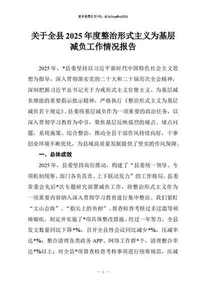 【七哥公文】2026年:关于全县2025年度整治形式主义为基层减负工作情况报告+更多免费公文+VX:QiGeGongWen2024